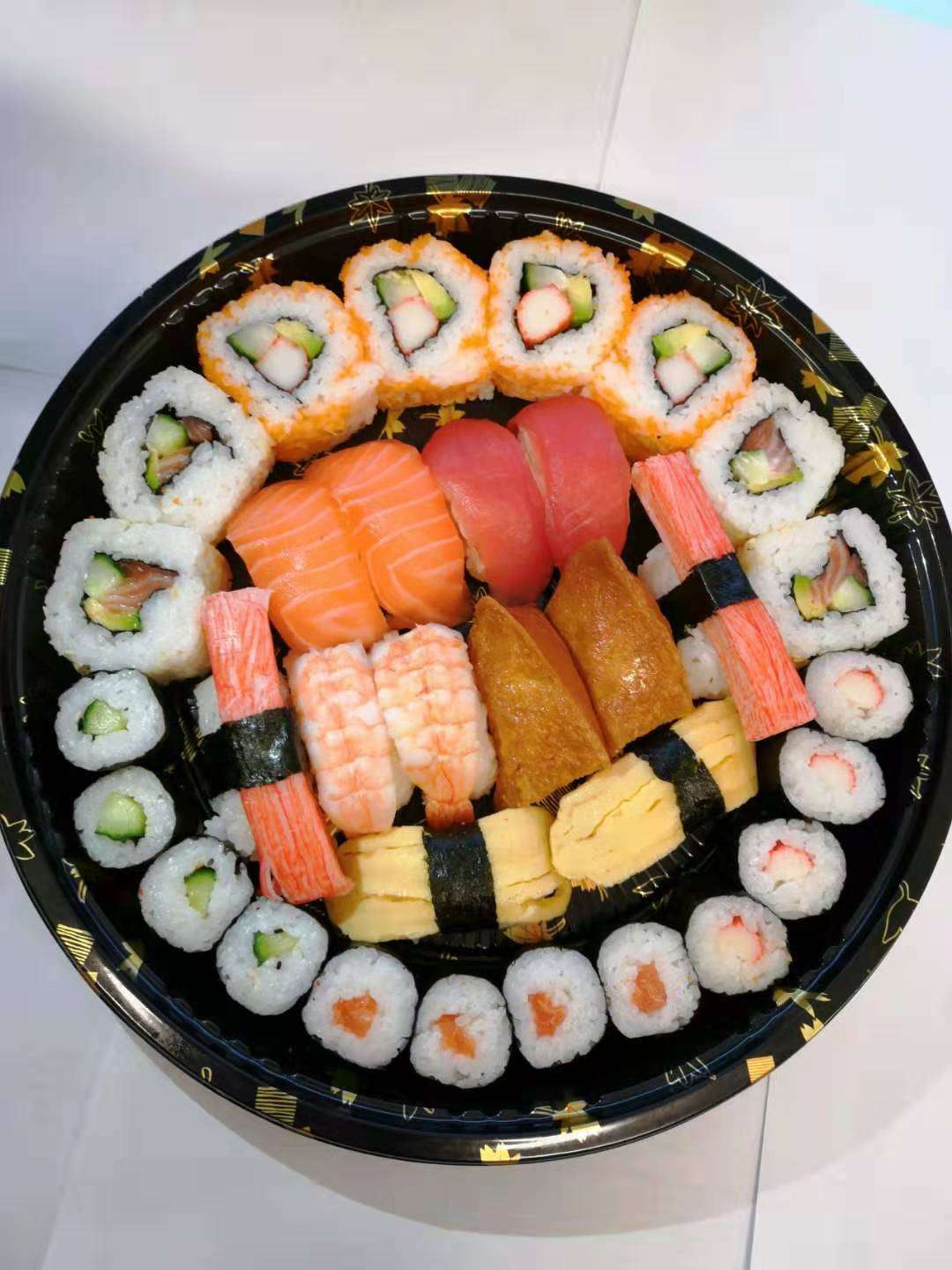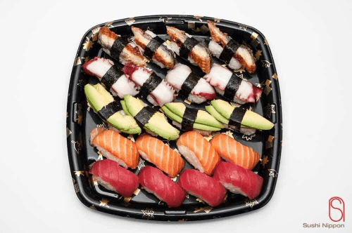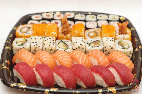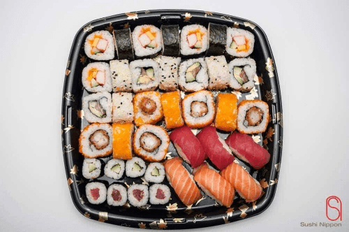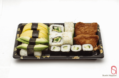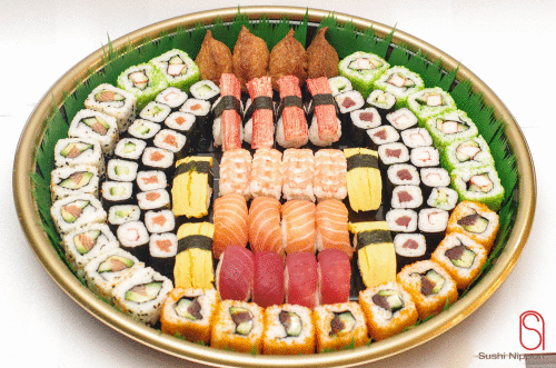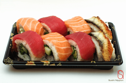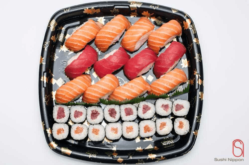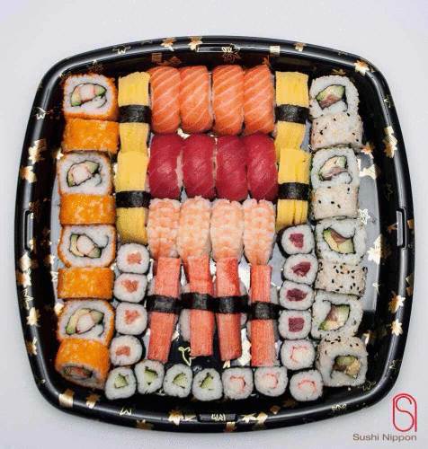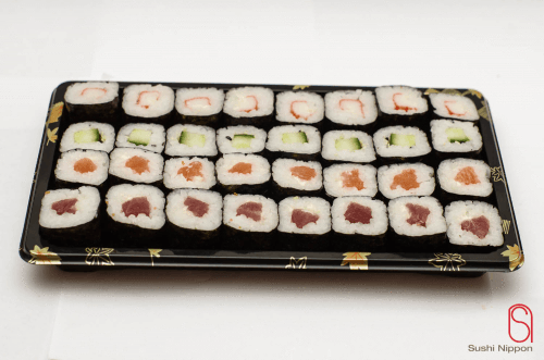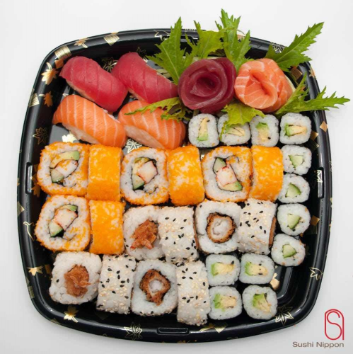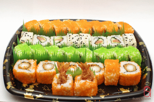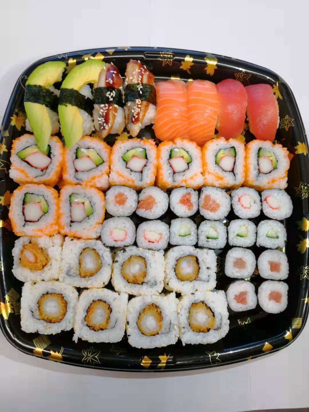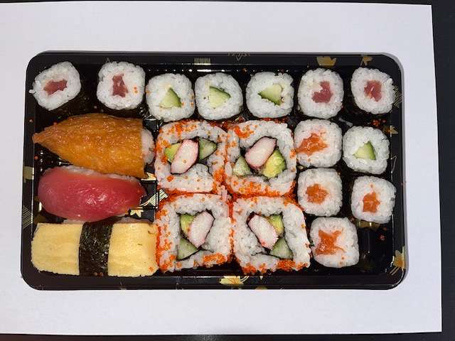 8 stuks ebi tempura roll ,8 stuks ukimaki sake roll ,16 stuks hosomaki ,6 stuks nigiri zalm ,6 stuks nigiri tonijn