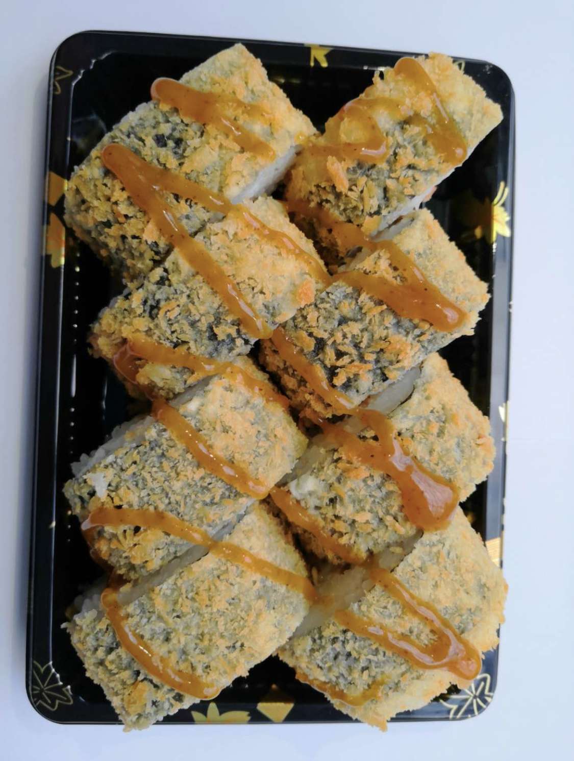 in tempura beslag gefrituurde garnalen met avocado ,unagi saus ,mayonaise,lente ui en gebakken ui