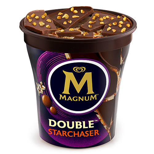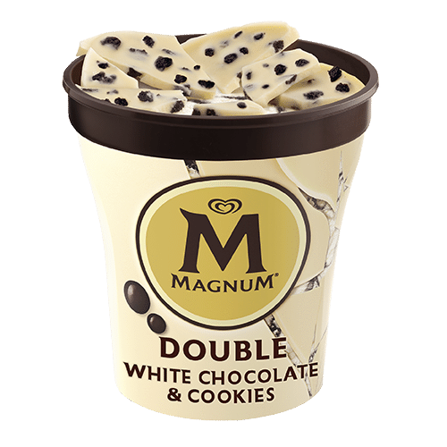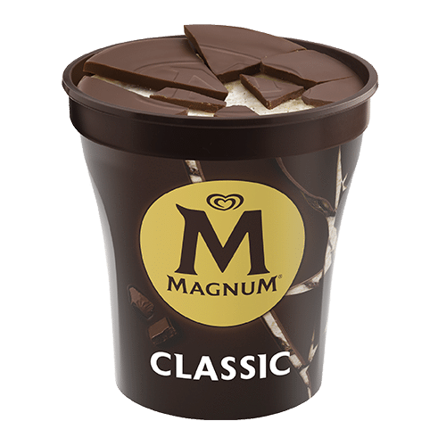 Fluweelzacht vanille-ijs met stukken chocolade, geheel omhuld in een intense laag krakende Magnum chocolade